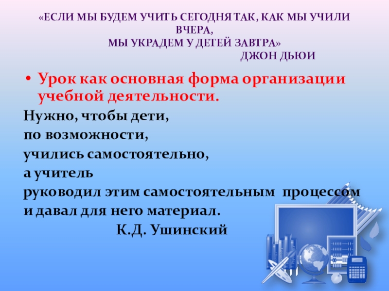 Слайд 5«Если мы будем учить сегодня так, как мы учили вчера,