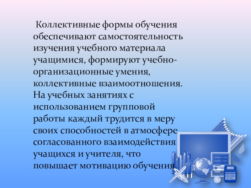Слайд 17 Коллективные формы обучения обеспечивают самостоятельность изучения учебного материала учащимися, формируют