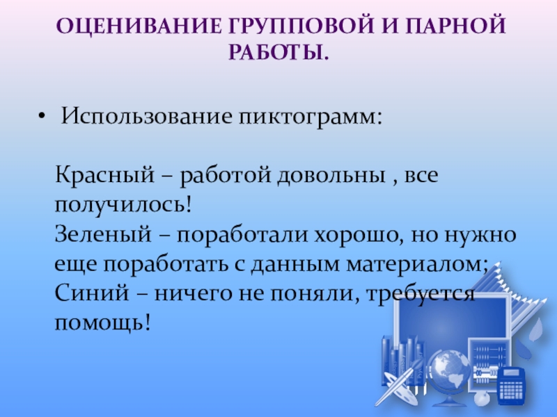 Зеленый – поработали хорошо, но нужно еще поработать с данным материалом;