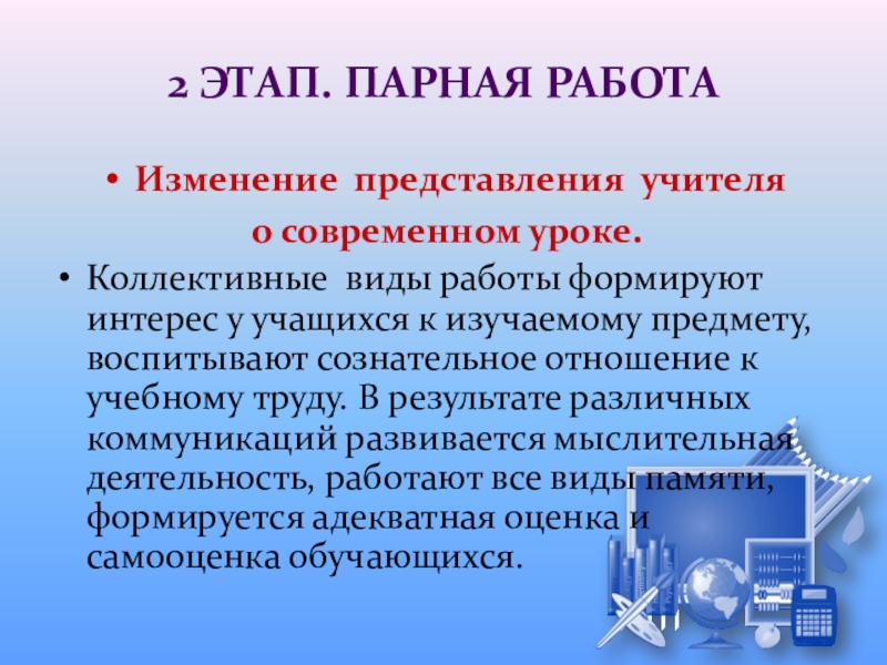 виды работы формируют интерес у учащихся к изучаемому предмету, воспитывают сознательное отношение к учебному труду. В результате различных коммуникаций развивается мыслительная деятельность, работают все виды памяти, формируется адекватная оценка и самооценка обучающихся.