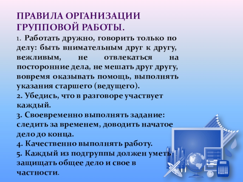 5. Каждый из подгруппы должен уметь защищать общее дело и свое в частности.