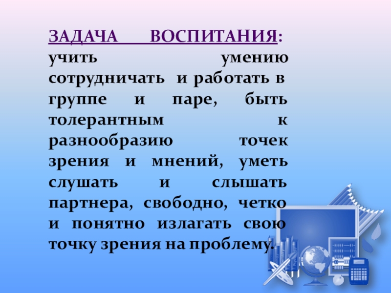 Слайд 18Задача воспитания: учить умению сотрудничать и работать в группе и паре,