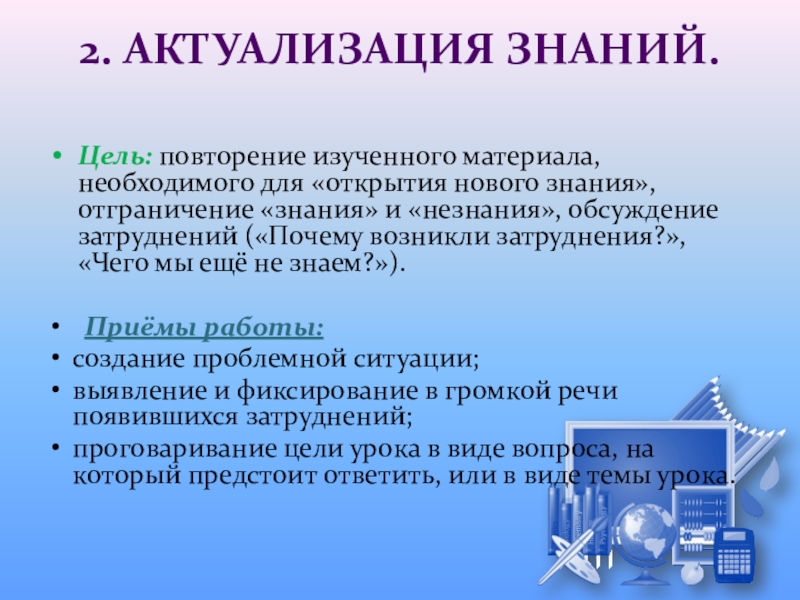 знания», отграничение «знания» и «незнания», обсуждение затруднений («Почему возникли затруднения?», «Чего мы ещё не знаем?»).