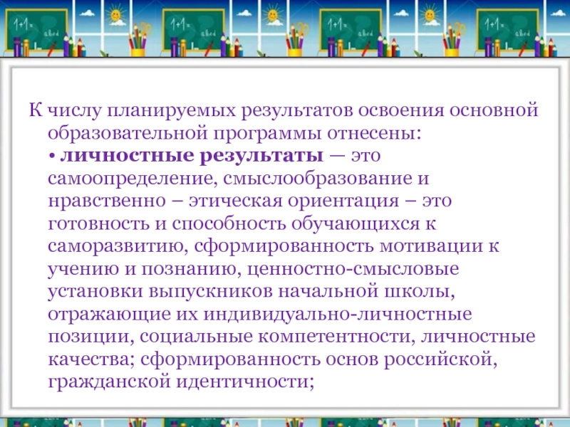самоопределение, смыслообразование и нравственно – этическая ориентация – это готовность и способность обучающихся к саморазвитию, сформированность мотивации к учению и познанию, ценностно-смысловые установки выпускников начальной школы, отражающие их индивидуально-личностные позиции, социальные компетентности, личностные качества; сформированность основ российской, гражданской идентичности;