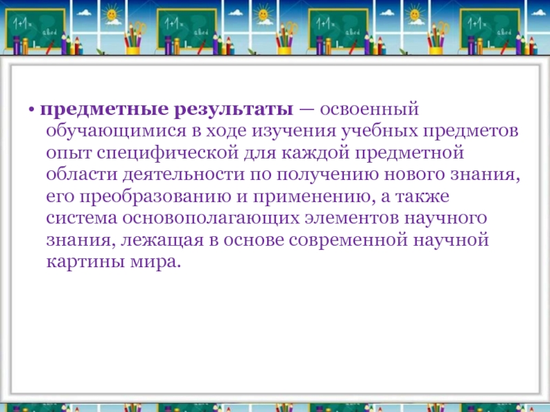 Слайд 7• предметные результаты — освоенный обучающимися в ходе изучения учебных предметов опыт специфической
