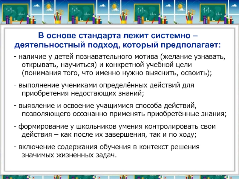 Слайд 8В основе стандарта лежит системно – деятельностный подход, который предполагает: