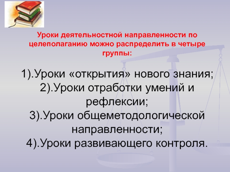 Слайд 9Уроки деятельностной направленности по целеполаганию можно распределить в четыре группы: