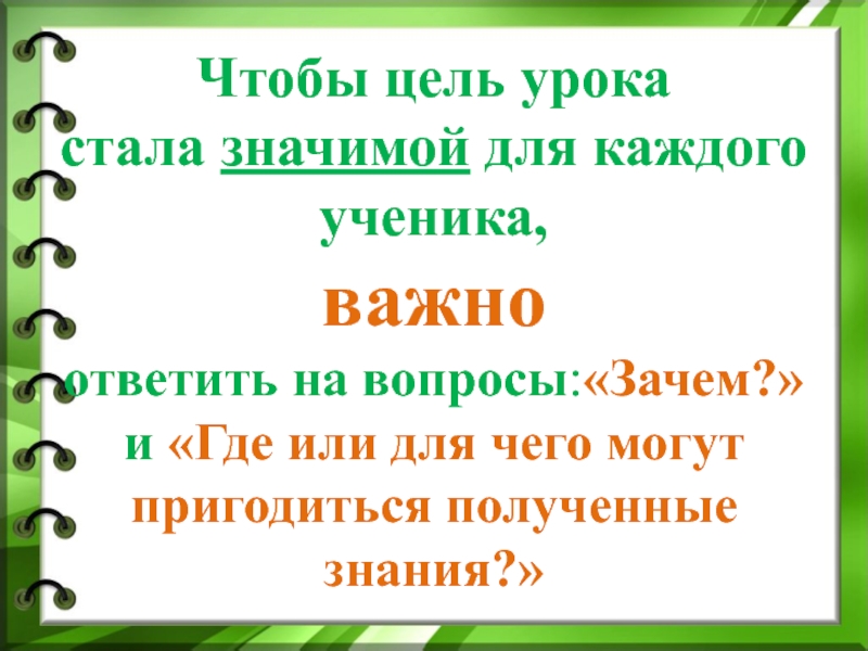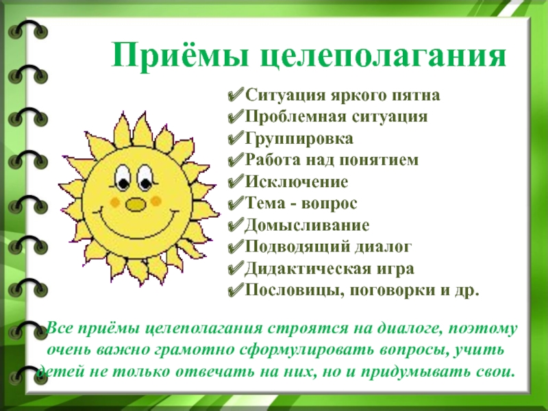 Все приёмы целеполагания строятся на диалоге, поэтому очень важно грамотно сформулировать вопросы, учить детей не только отвечать на них, но и придумывать свои.