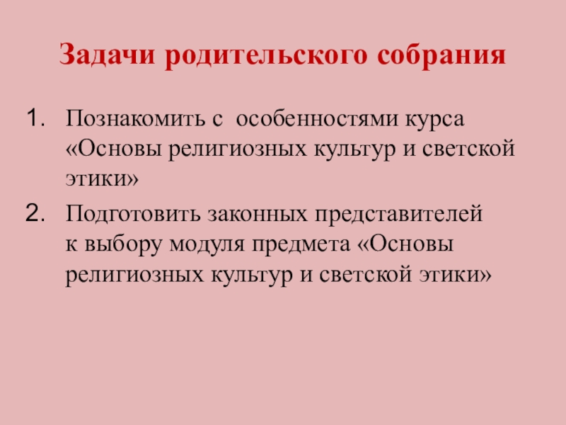 Задачи родительского собранияПознакомить с особенностями курса «Основы религиозных культур и светской этики»Подготовить законных представителей к выбору модуля предмета «Основы религиозных культур и светской этики»