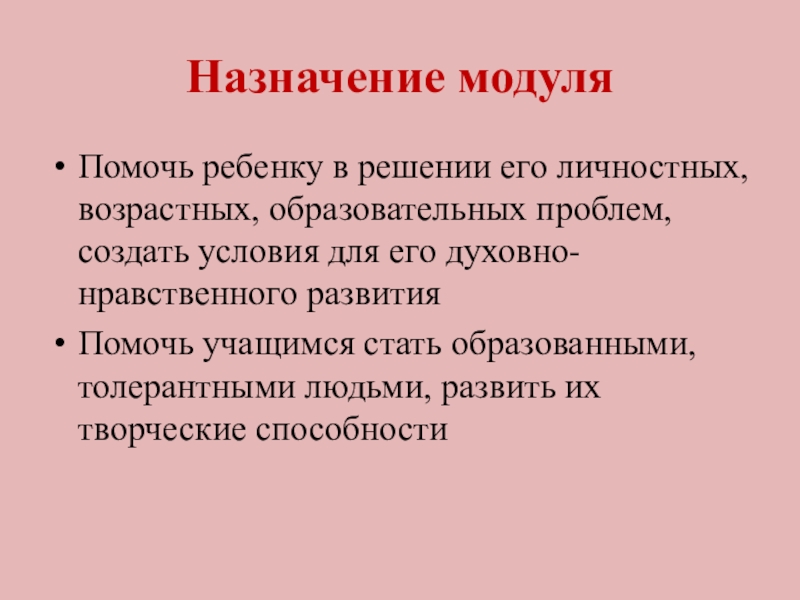 Назначение модуляПомочь ребенку в решении его личностных, возрастных, образовательных проблем, создать условия для его духовно-нравственного развитияПомочь учащимся