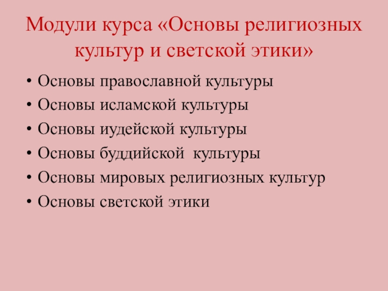 Модули курса «Основы религиозных культур и светской этики»Основы православной культурыОсновы исламской культурыОсновы иудейской культурыОсновы буддийской культурыОсновы мировых