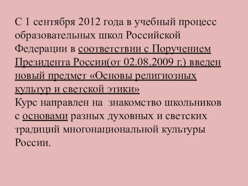 Федерации в соответствии с Поручением Президента России(от 02.08.2009 г.) введен новый предмет «Основы религиозных культур и светской этики» Курс направлен на знакомство школьников с основами разных духовных и светских традиций многонациональной культуры России.