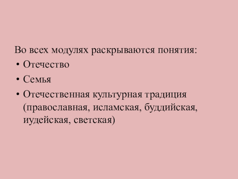 Во всех модулях раскрываются понятия:ОтечествоСемьяОтечественная культурная традиция (православная, исламская, буддийская, иудейская, светская)