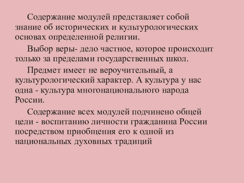 Содержание модулей представляет собой знание об исторических и культурологических основах определенной религии.	Выбор веры- дело частное, которое происходит