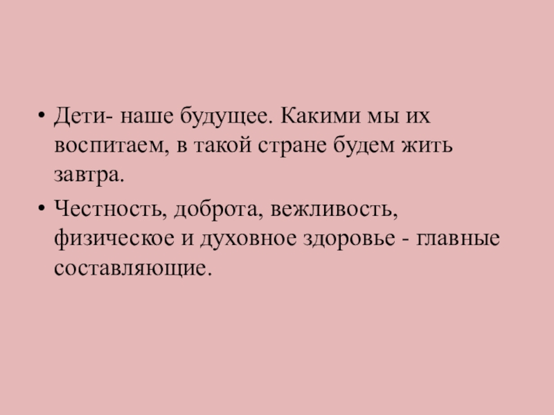 Дети- наше будущее. Какими мы их воспитаем, в такой стране будем жить завтра.Честность, доброта, вежливость, физическое и