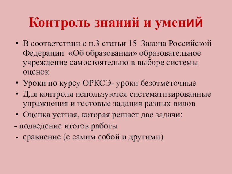 Контроль знаний и уменийВ соответствии с п.3 статьи 15 Закона Российской Федерации «Об образовании» образовательное учреждение самостоятельно