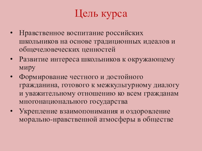Цель курсаНравственное воспитание российских школьников на основе традиционных идеалов и общечеловеческих ценностейРазвитие интереса школьников к окружающему мируФормирование
