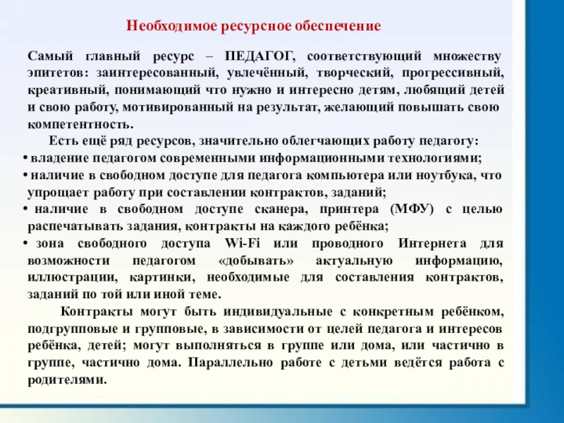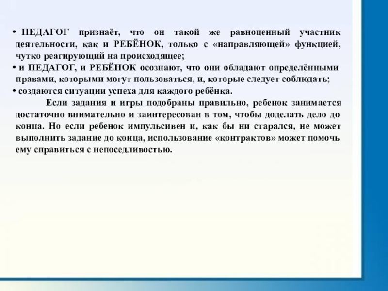 ПЕДАГОГ признаёт, что он такой же равноценный участник деятельности, как и РЕБЁНОК, только с «направляющей» функцией, чутко реагирующий на происходящее;