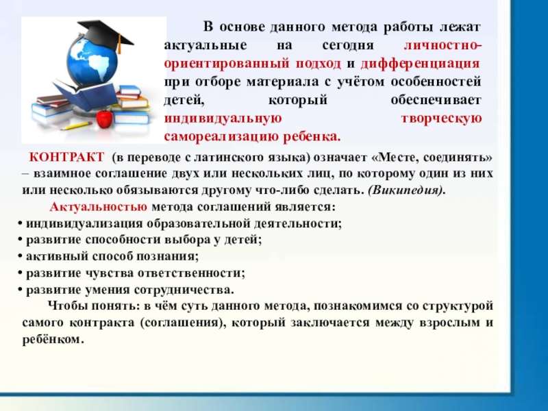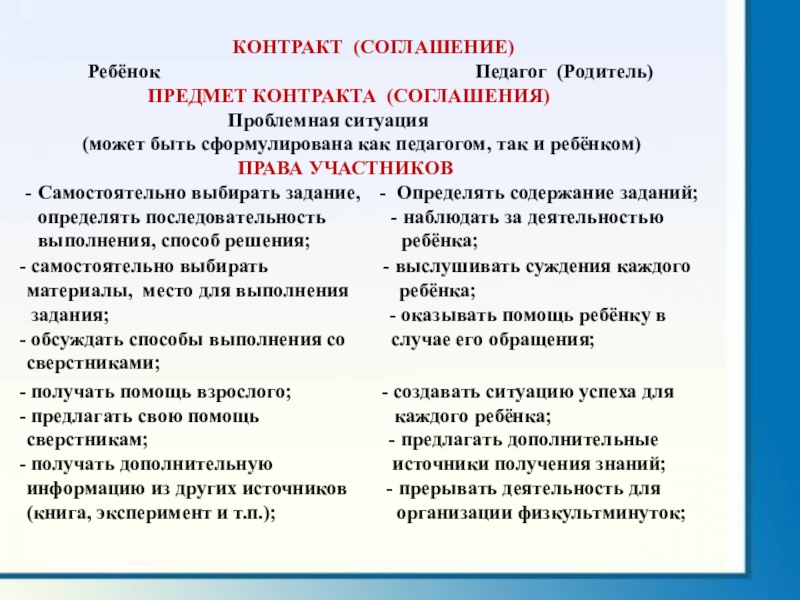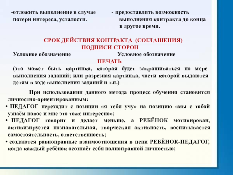 Чтобы понять: в чём суть данного метода, познакомимся со структурой самого контракта (соглашения), который заключается между взрослым и ребёнком.