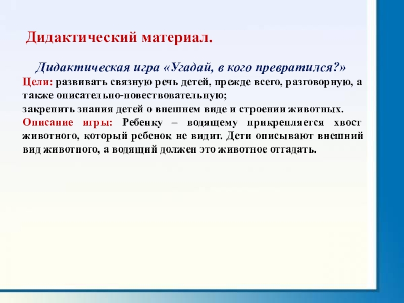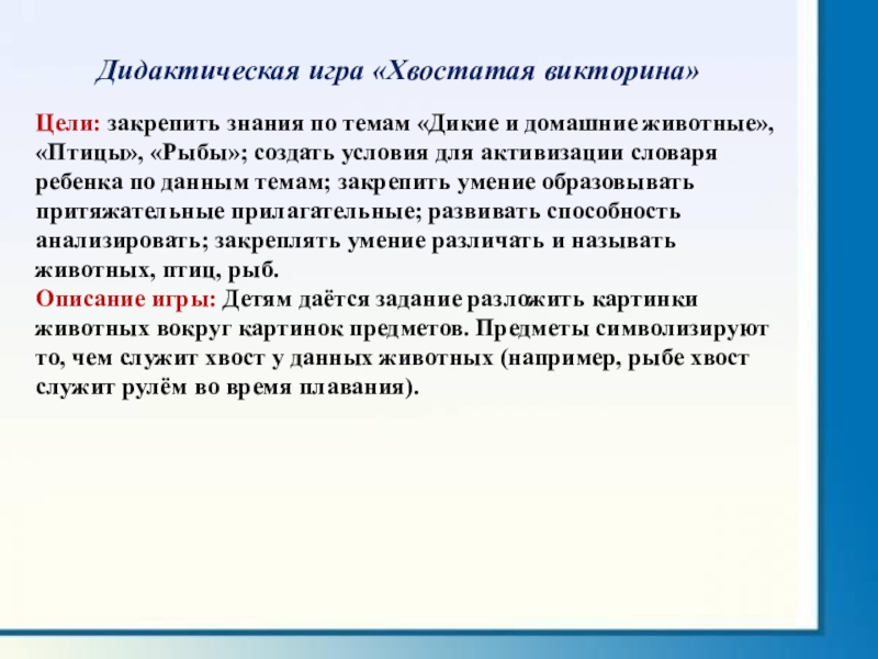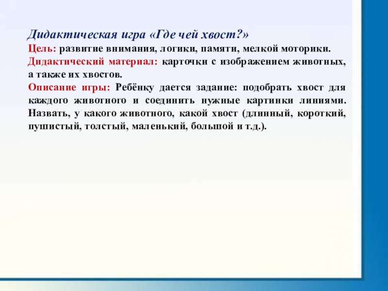 Описание игры: Ребенку – водящему прикрепляется хвост животного, который ребенок не видит. Дети описывают внешний вид животного, а водящий должен это животное отгадать.