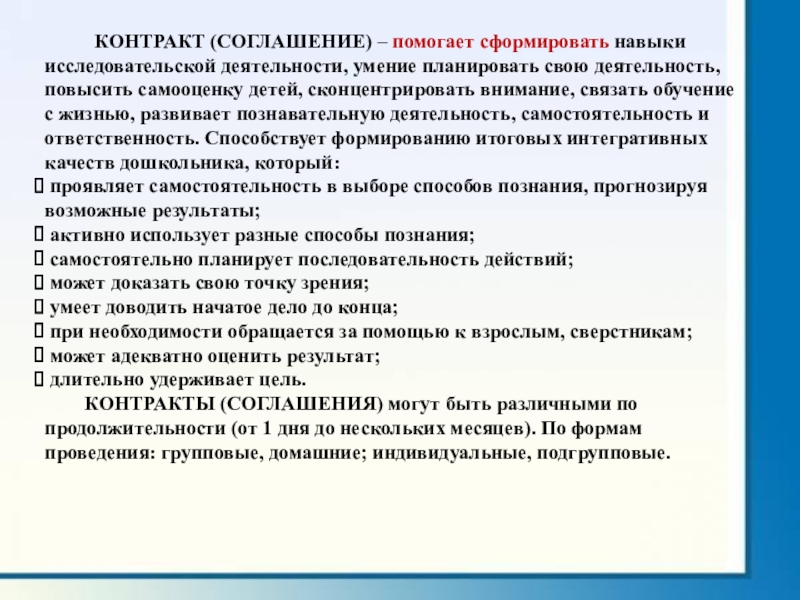 КОНТРАКТ (СОГЛАШЕНИЕ) – помогает сформировать навыки исследовательской деятельности, умение планировать свою деятельность, повысить самооценку детей, сконцентрировать внимание, связать обучение с жизнью, развивает познавательную деятельность, самостоятельность и ответственность. Способствует формированию итоговых интегративных качеств дошкольника, который: