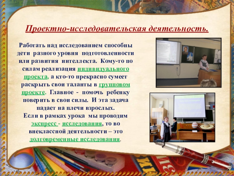 Если в рамках урока мы проводим экспресс - исследования, то во внеклассной деятельности – это долговременные исследования.