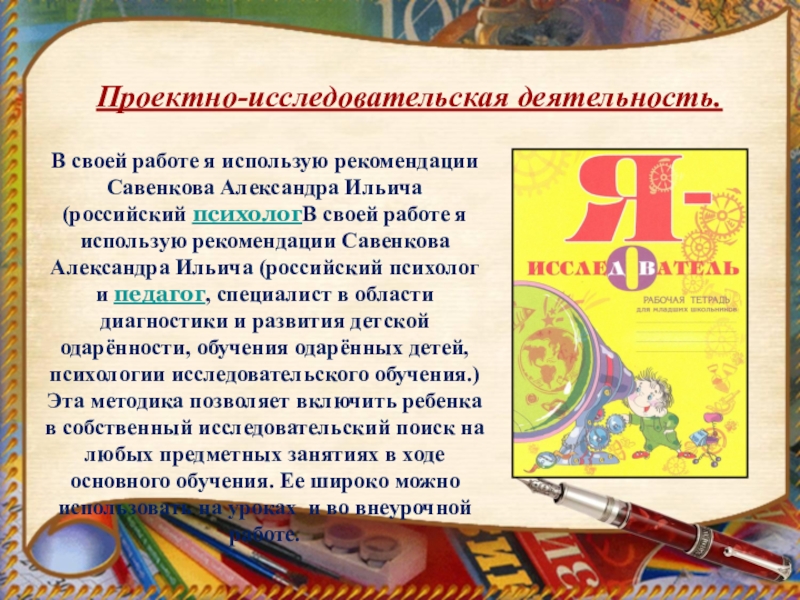 психологВ своей работе я использую рекомендации Савенкова Александра Ильича (российский психолог и педагог, специалист в области диагностики и развития детской одарённости, обучения одарённых детей, психологии исследовательского обучения.) Эта методика позволяет включить ребенка в собственный исследовательский поиск на любых предметных занятиях в ходе основного обучения. Ее широко можно использовать на уроках и во внеурочной работе.