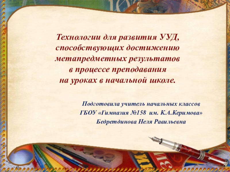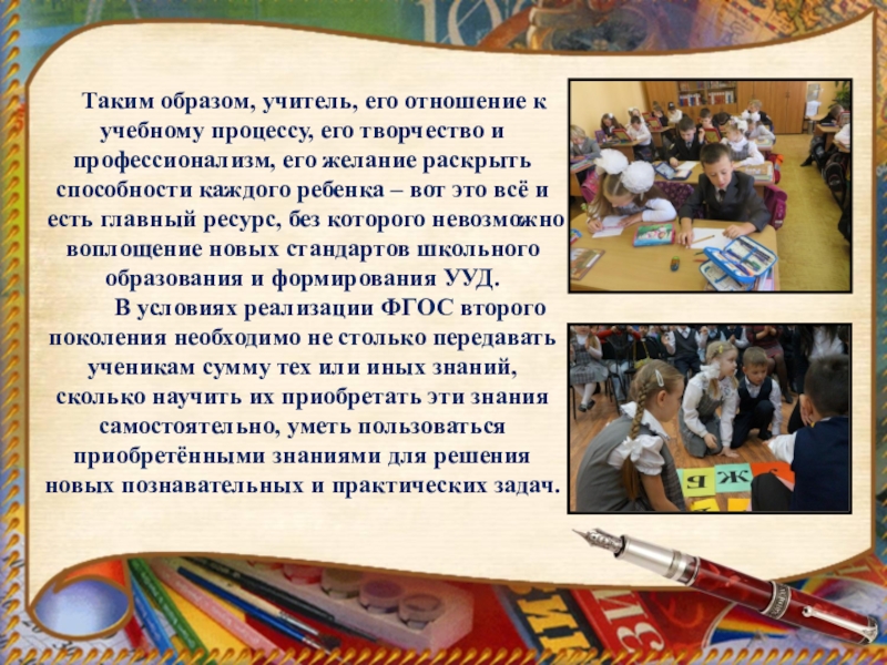 его отношение к учебному процессу, его творчество и профессионализм, его желание раскрыть способности каждого ребенка – вот это всё и есть главный ресурс, без которого невозможно воплощение новых стандартов школьного образования и формирования УУД.
