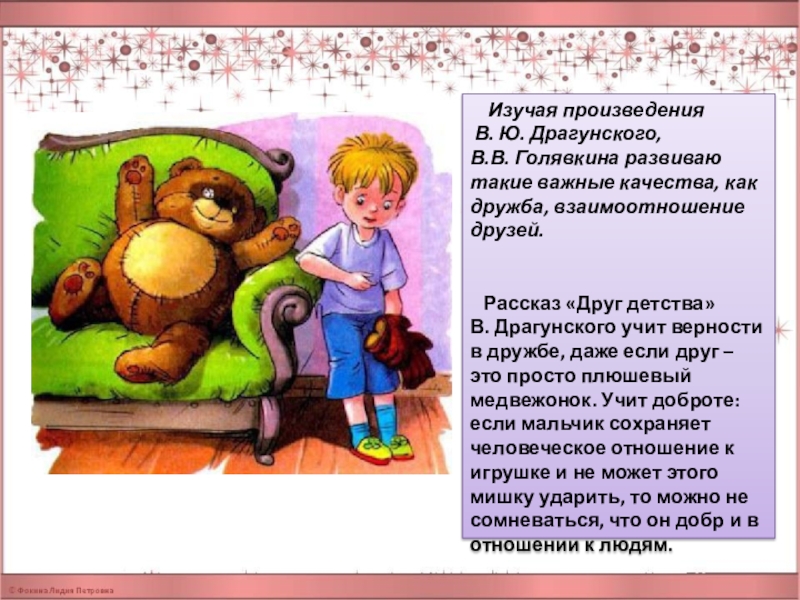 В. Драгунского учит верности в дружбе, даже если друг – это просто плюшевый медвежонок. Учит доброте: если мальчик сохраняет человеческое отношение к игрушке и не может этого мишку ударить, то можно не сомневаться, что он добр и в отношении к людям.