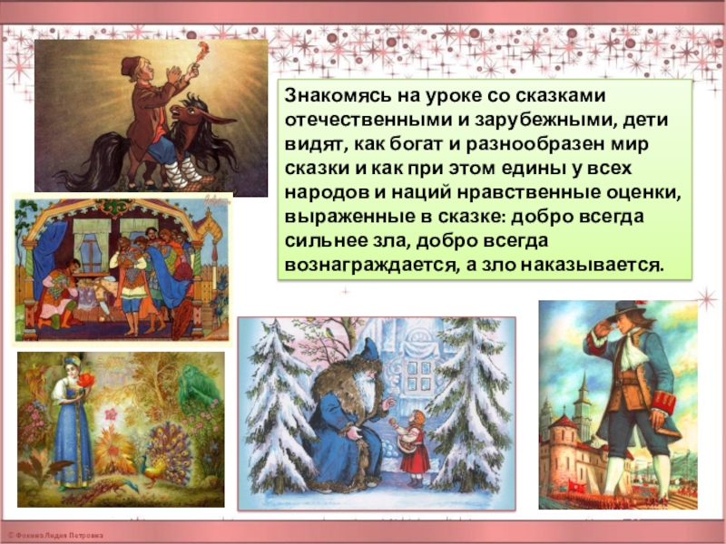 Слайд 17Знакомясь на уроке со сказками отечественными и зарубежными, дети видят, как