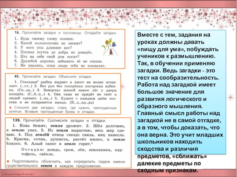 побуждать учеников к размышлению. Так, в обучении применяю загадки. Ведь загадки - это тест на сообразительность. Работа над загадкой имеет большое значение для развития логического и образного мышления. Главный смысл работы над загадкой не в самой отгадке, а в том, чтобы доказать, что она верна. Это учит младших школьников находить сходства и различия предметов, «сближать» далекие предметы по сходным признакам.