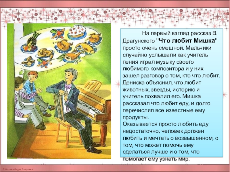 Дениска объяснил, что любит животных, звезды, историю и учитель похвалил его. Мишка рассказал что любит еду, и долго перечислял все известные ему продукты.