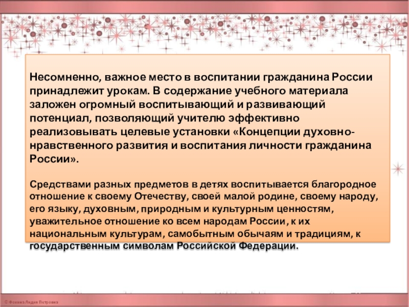 учебного материала заложен огромный воспитывающий и развивающий потенциал, позволяющий учителю эффективно реализовывать целевые установки «Концепции духовно-нравственного развития и воспитания личности гражданина России».