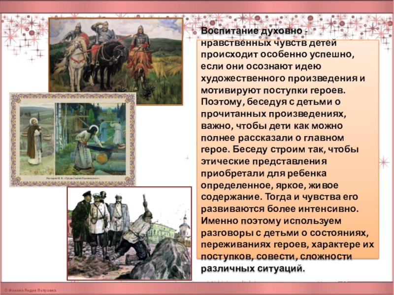 фольклорные произведения народов России, литературные тексты исторического содержания, работая с которыми дети постигают простые и вечные истины добра, сострадания, сочувствия, любви к другим людям, к Родине, чувство патриотизма и гордости за свою страну.