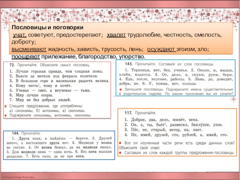 учат, советуют, предостерегают; хвалят трудолюбие, честность, смелость,