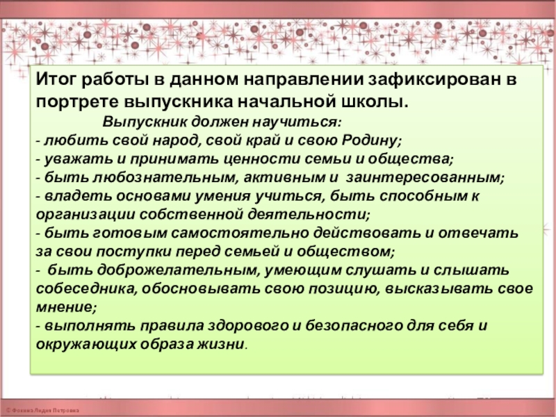 Слайд 4Итог работы в данном направлении зафиксирован в портрете выпускника начальной школы.
