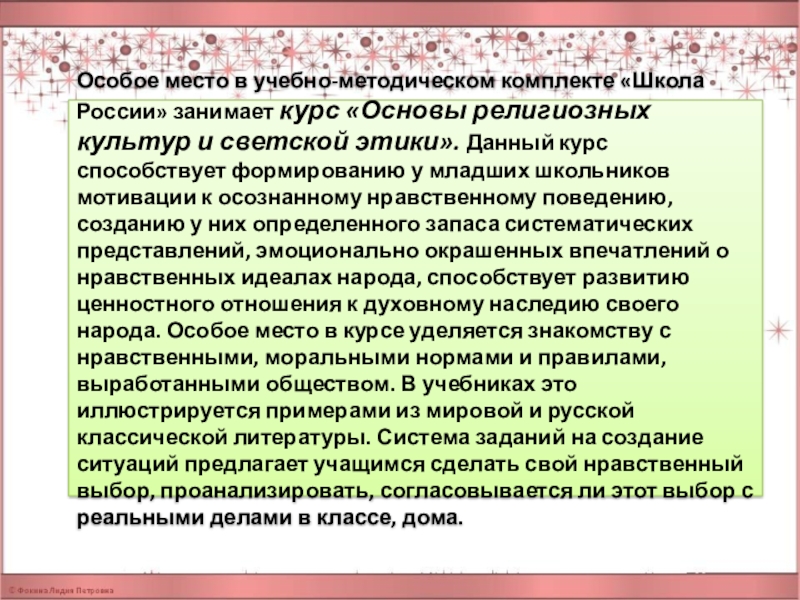 культур и светской этики». Данный курс способствует формированию у младших школьников мотивации к осознанному нравственному поведению, созданию у них определенного запаса систематических представлений, эмоционально окрашенных впечатлений о нравственных идеалах народа, способствует развитию ценностного отношения к духовному наследию своего народа. Особое место в курсе уделяется знакомству с нравственными, моральными нормами и правилами, выработанными обществом. В учебниках это иллюстрируется примерами из мировой и русской классической литературы. Система заданий на создание ситуаций предлагает учащимся сделать свой нравственный выбор, проанализировать, согласовывается ли этот выбор с реальными делами в классе, дома.