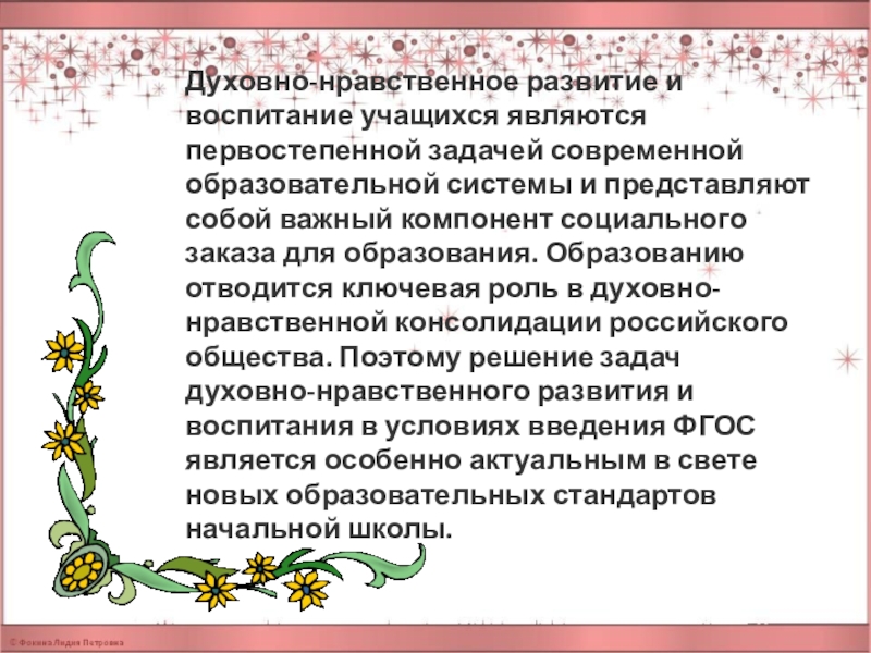 и представляют собой важный компонент социального заказа для образования. Образованию отводится ключевая роль в духовно-нравственной консолидации российского общества. Поэтому решение задач духовно-нравственного развития и воспитания в условиях введения ФГОС является особенно актуальным в свете новых образовательных стандартов начальной школы.