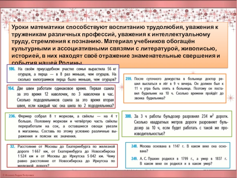 Слайд 18Уроки математики способствуют воспитанию трудолюбия, уважения к труженикам различных профессий, уважения