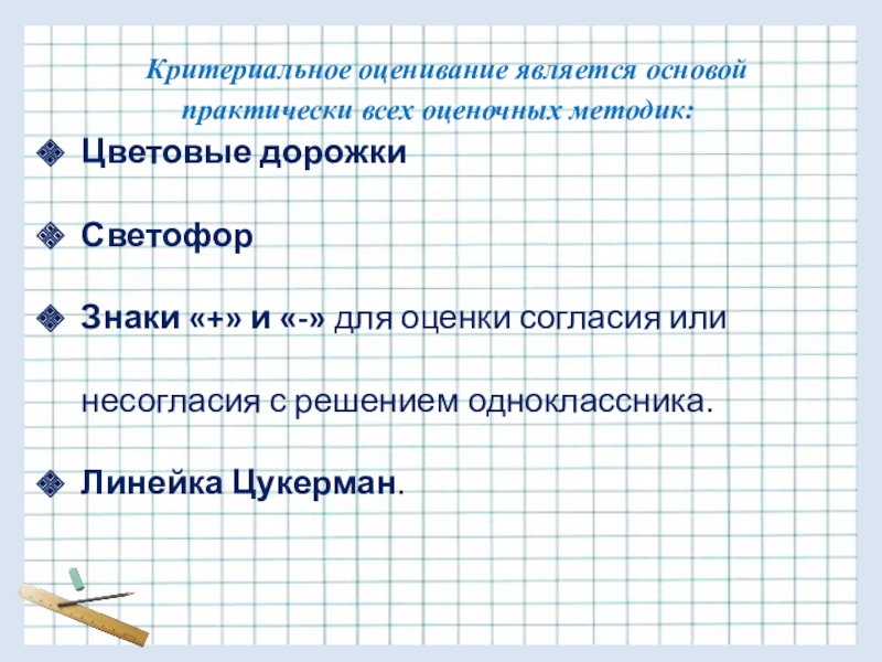 Слайд 4Критериальное оценивание является основой практически всех оценочных методик: