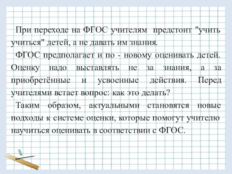 ФГОС предполагает и по - новому оценивать детей. Оценку надо выставлять не за знания, а за приобретённые и усвоенные действия. Перед учителями встает вопрос: как это делать?