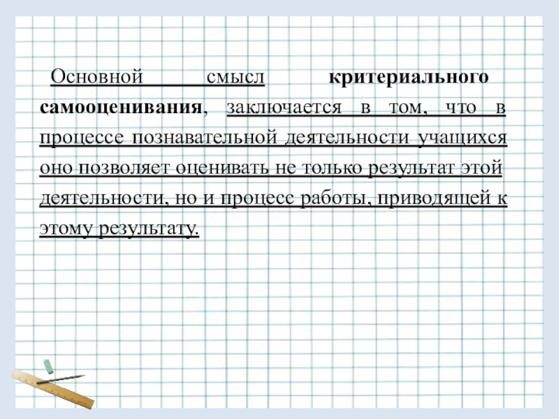 Слайд 3Основной смысл критериального самооценивания, заключается в том, что в процессе познавательной