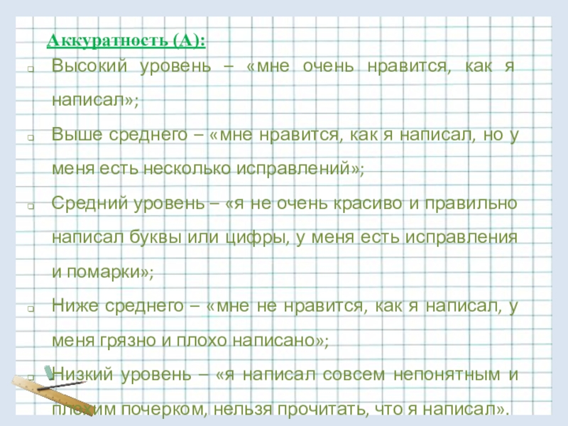 Средний уровень – «я не очень красиво и правильно написал буквы или цифры, у меня есть исправления и помарки»;