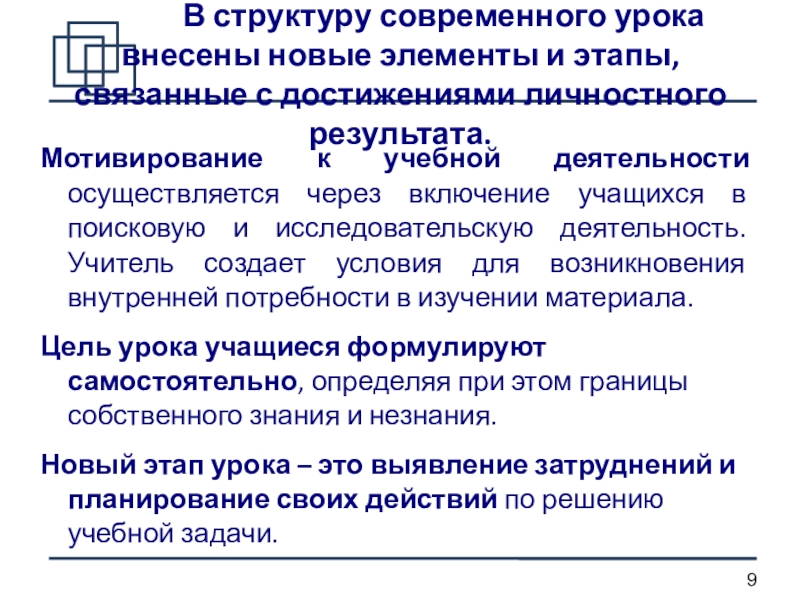 Мотивирование к учебной деятельности осуществляется через включение учащихся в поисковую и исследовательскую деятельность. Учитель создает условия для возникновения внутренней потребности в изучении материала.