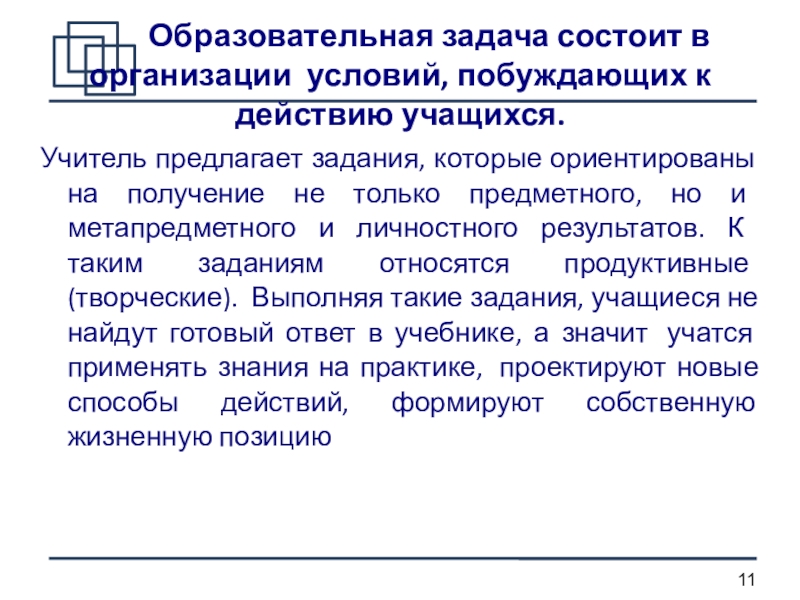Учитель предлагает задания, которые ориентированы на получение не только предметного, но и метапредметного и личностного результатов. К таким заданиям относятся продуктивные (творческие). Выполняя такие задания, учащиеся не найдут готовый ответ в учебнике, а значит учатся применять знания на практике, проектируют новые способы действий, формируют собственную жизненную позицию