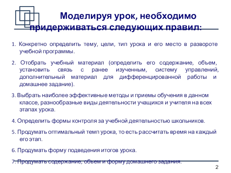 2. Отобрать учебный материал (определить его содержание, объем, установить связь с ранее изученным, систему управлений, дополнительный материал для дифференцированной работы и домашнее задание).