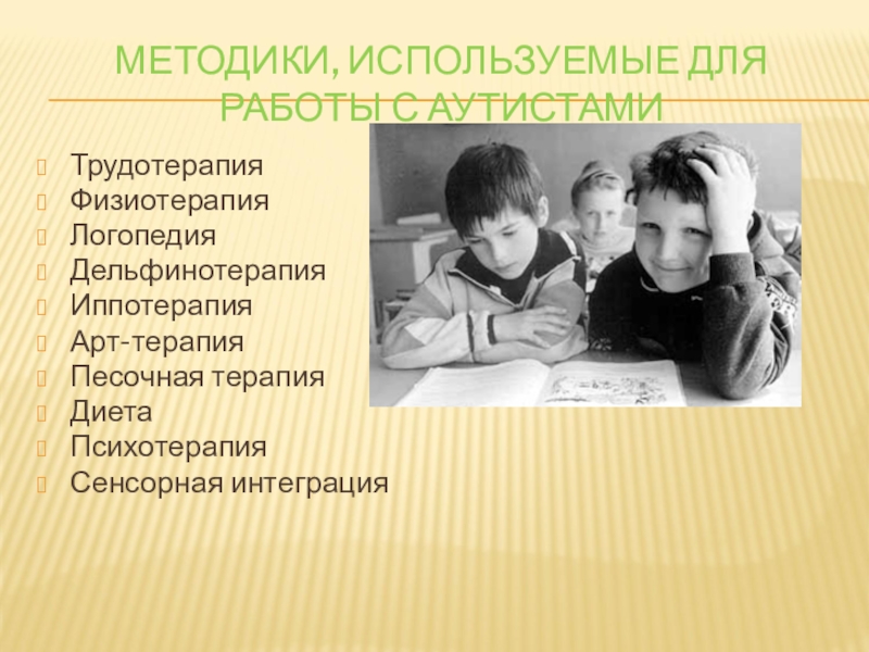 Слайд 27МЕТОДИКИ, ИСПОЛЬЗУЕМЫЕ ДЛЯ РАБОТЫ С АУТИСТАМИ