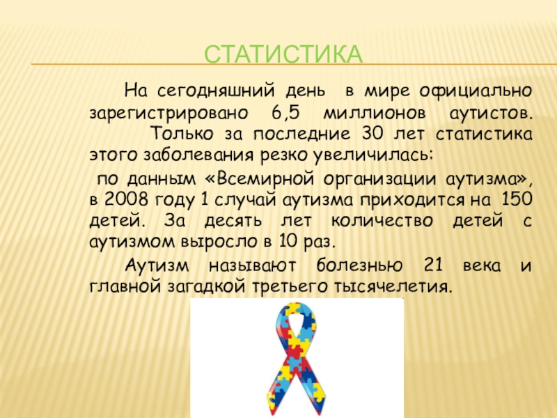 по данным «Всемирной организации аутизма», в 2008 году 1 случай аутизма приходится на 150 детей. За десять лет количество детей с аутизмом выросло в 10 раз.