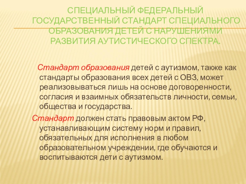 Стандарт образования детей с аутизмом, также как стандарты образования всех детей с ОВЗ, может реализовываться лишь на основе договоренности, согласия и взаимных обязательств личности, семьи, общества и государства.