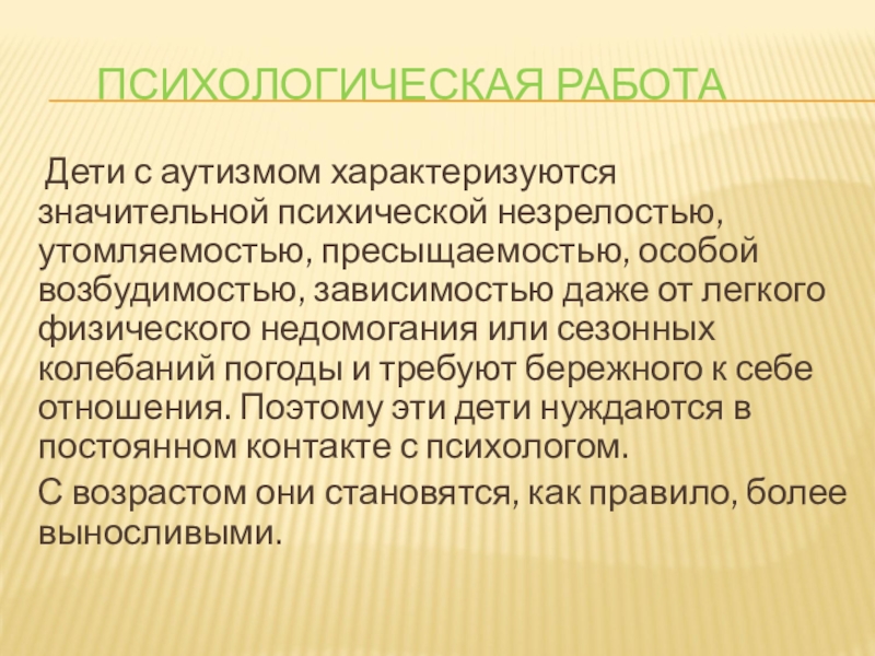 Дети с аутизмом характеризуются значительной психической незрелостью, утомляемостью, пресыщаемостью,